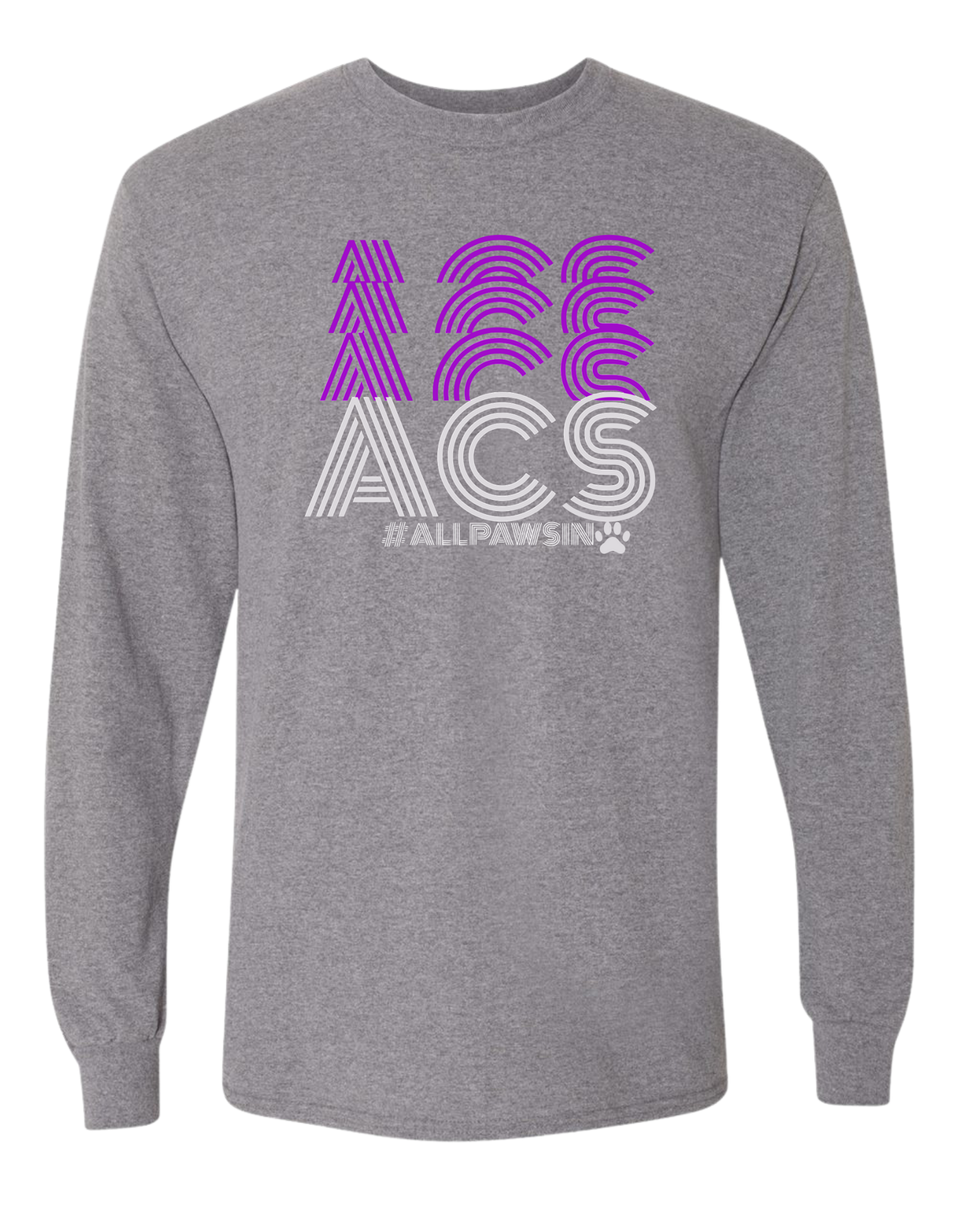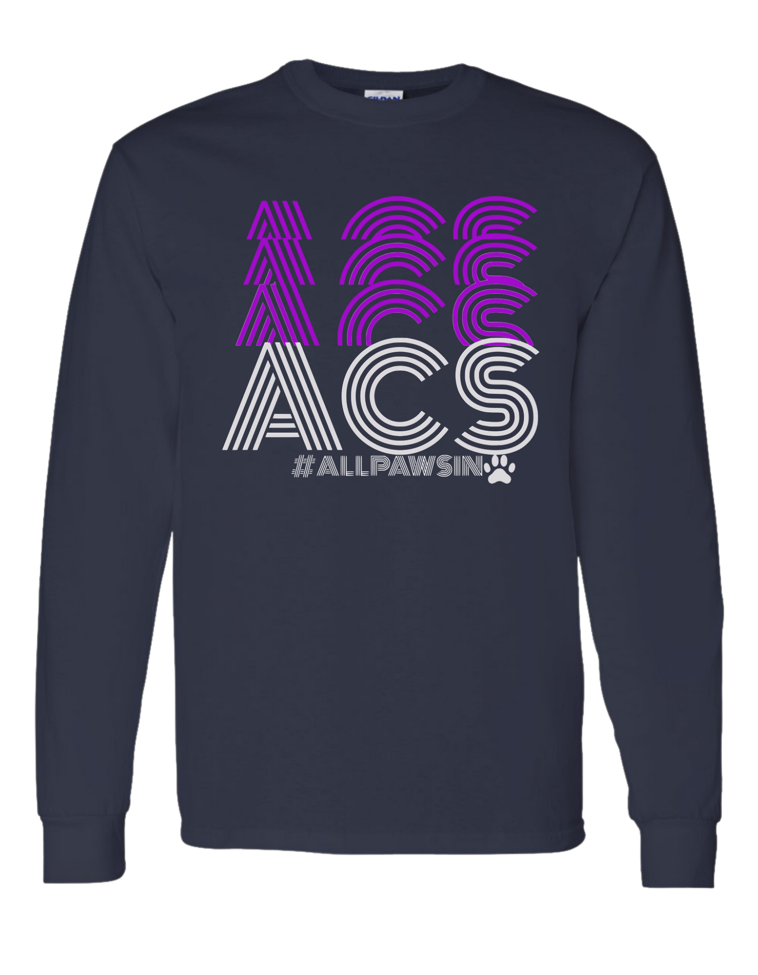 Show your school spirit with the ACS Repeat Long Sleeve! Featuring a bold, stacked "ACS" design and the hashtag #ALLPAWSIN, this shirt is perfect for students, staff, and fans alike. Made with soft, comfortable fabric and available in classic navy or soft lavender, it's a must-have for any proud member of the Alamance Community School.
