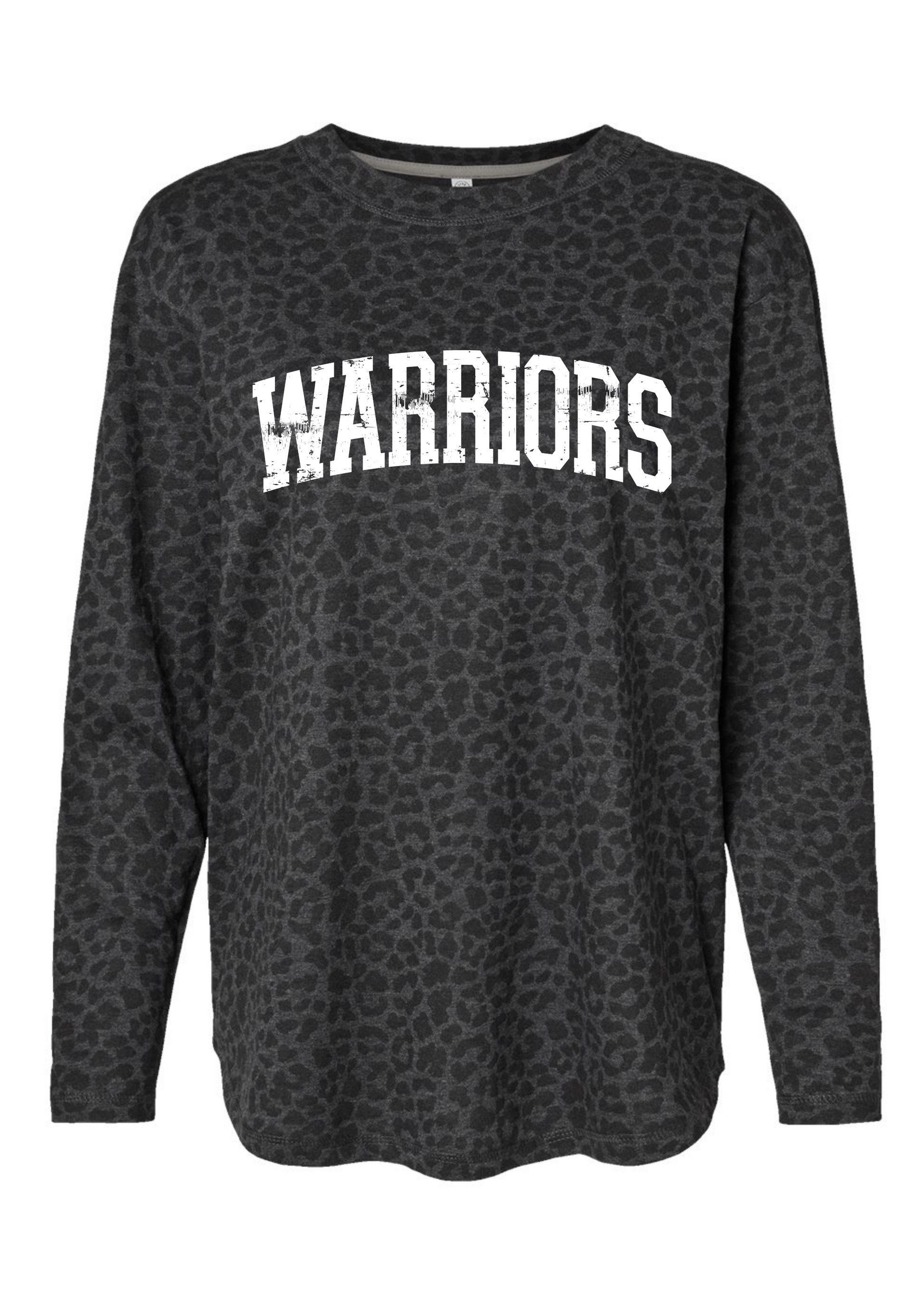This long-sleeve shirt features a bold white grunge-style "Warriors" print layered over a striking leopard pattern, combining edgy graphic design with classic animal print for a distinctive look.